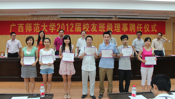 当天,2012届校友班级理事聘任仪式分别在育才校区和雁山校区举行。184名2012届毕业生济济一堂,没有毕业临近前的伤感,更多的是对“校友班级理事”这一新身份的期待。“每一名从广西师范大学校园走出的毕业生,都是母校递给社会的一张名片;而每一位师大的校友班级理事所承担的,也不仅仅是个人的成功与失败,他还肩负着我们这所深沉而厚重的大学对全社会的责任与承诺。”2012届校友班级理事代表、物理科学与技术学院科学教育专业石雪花同学如是说。