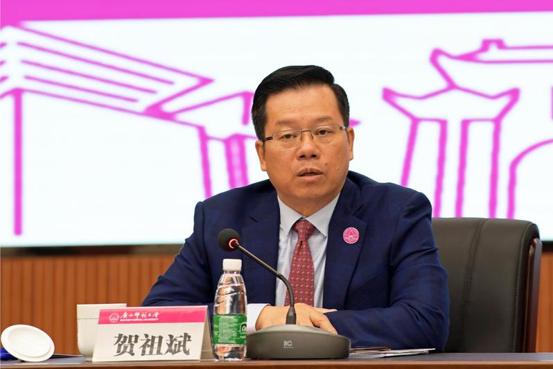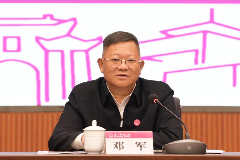 校党委邓军书记在会上讲话。邓军向校友介绍了近年广西师范大学发展取得的成就,同时指出学校建校88年以来,母校始终弘扬“尊师重道 敬业乐群”的校训,始终坚持育人济世、传承创新的大学使命,始终坚守教师教育的优良传统,努力践行“立德树人”的根本任务,昂扬奋勇前行。他对企业家校友联谊会长期以来,尤其是今年新冠肺炎疫情发生以来心系母校、协同合作的行动表示充分肯定。他希望各位企业家校友以“弘扬师大精神、激发创业热情、承担社会责任、促进交流合作”为己任,与学校一起大胆创新、宽容并进,为实现“扶持校友产业发展”这一初衷与目标而努力。
