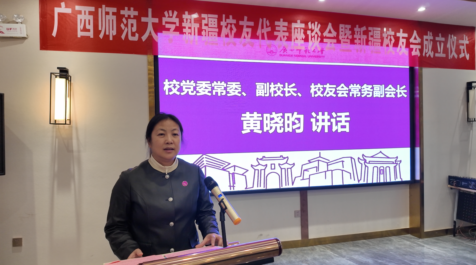 成立仪式上,黄晓昀代表学校对新疆校友会的成立表示热烈祝贺,并向长期以来关心支持母校发展的广大校友致以诚挚感谢。她介绍了学校近年来在推进“1248”总体发展战略、深化“双一流”建设、优化学科布局、推动综合改革等方面取得的显著成效,强调校友是学校事业发展的重要力量和宝贵资源。她希望新疆校友会秉承“尊师重道、敬业乐群”的校训精神,团结凝聚广大在疆校友,打造“同心同向同行,共建共享共赢”的事业与命运共同体,为服务国家战略和区域发展贡献师大智慧和力量。